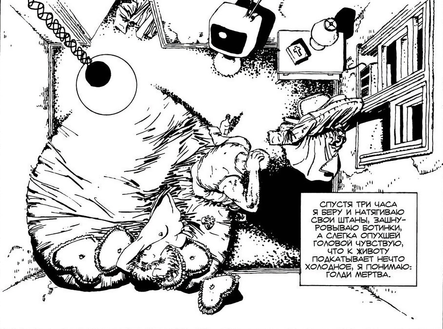 На этих изображениях, темная тень, которая поглощает Марвина символизирует моральную тьму, которая поглотила его, особенно после смерти Голди. Мы можем видеть, как больно главному герою «Бейсин Сити» Марвину, который потерял свою любимую девушку. Тень Марвина хорошо отражает его состояние, которое отлично передается читателю.