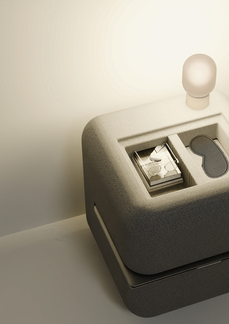 «Vibre» — бренд вибромассажных масок для сна. Специально для удобства хранения маски и прочих используемых незадолго до сна предметов разработана прикроватная тумба-пуф!