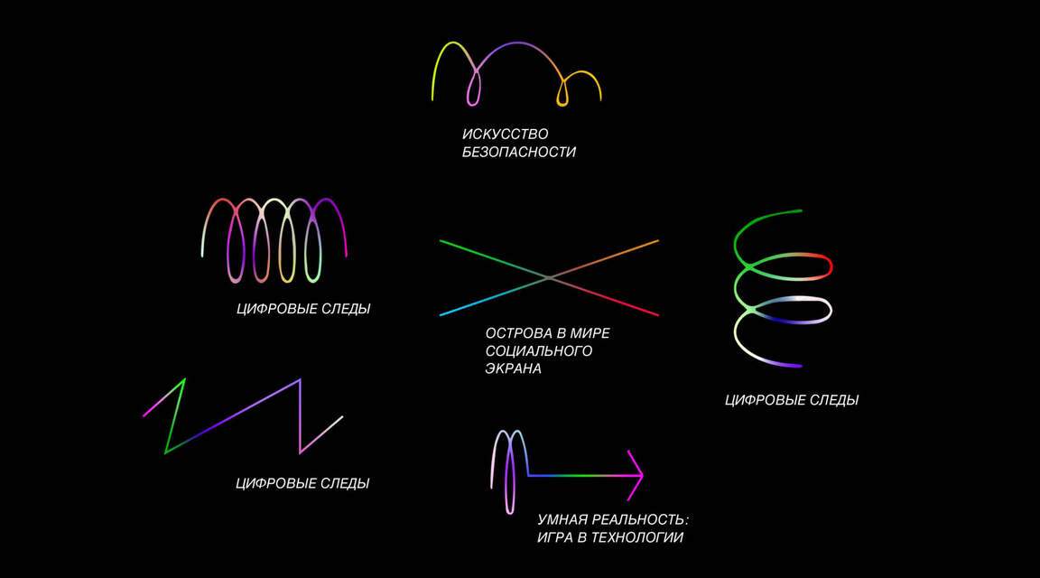 Выставочный сезон состоит из основных 4 выставок: «Цифровые следы», «Искусство безопасности», «Острова в мире социального экрана» и «Умная реальность: игра в технологии». Все они связаны с основной темой тесного взаимодействия виртуальных технологий и человека, то есть, «переплетения». Это стало основной метафорой визуального стиля.