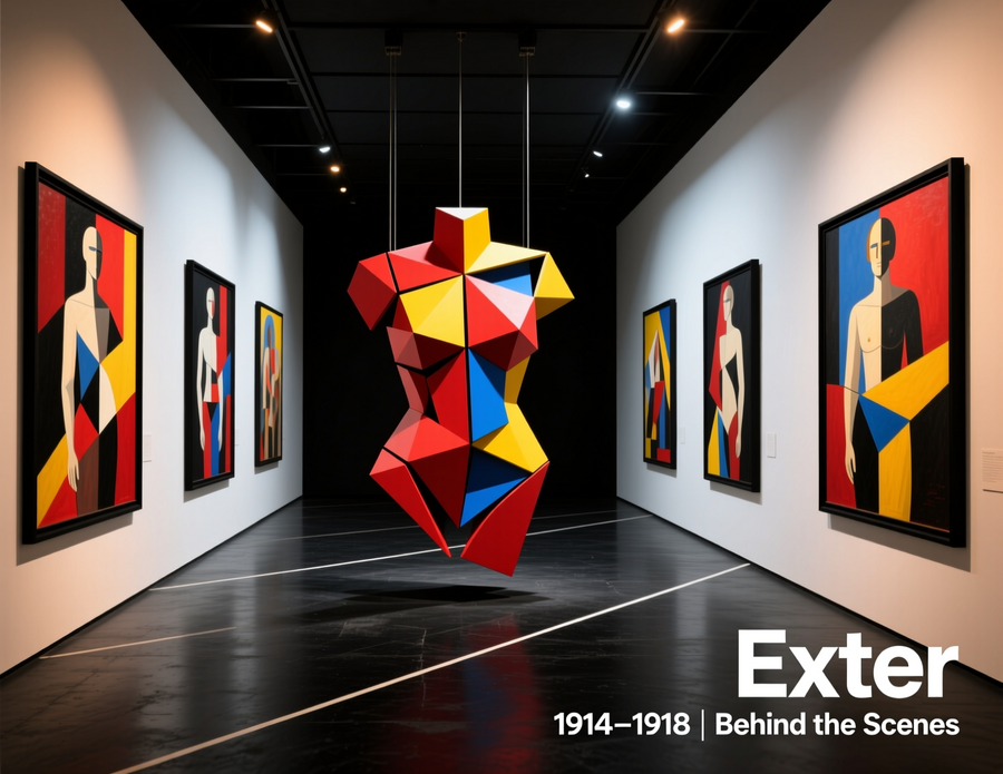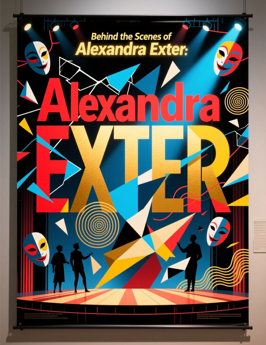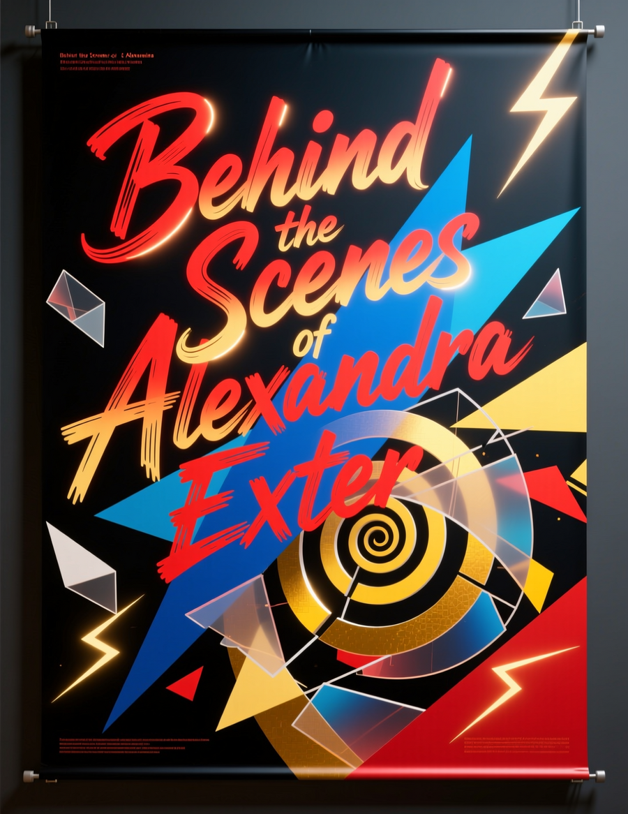 1-2. create an exhibition space called «behind the scenes of the Exter» by the avant-garde artist Alexandra Exter. The exhibition space should be made in red, black, blue and yellow colors. The shapes should be look alike Exter’s works in 1914-1918. There should be paintings by Alexandra Exter on the walls. (https://chat.qwen.ai/) 3. Create an image of a merchandise point of sale inside a учршишешщт ызфсу during the exhibition 'Behind the Scenes of Alexandra Exter'. The display should feature art-inspired merchandise, such as prints, postcards, and scarves, showcasing vibrant colors and abstract designs reminiscent of Exter’s style. The setting should include modernist design, red, blue and yellow colours, visitors browsing the items, and informational signage about the artist. Capture a lively yet sophisticated atmosphere that reflects the creative spirit of the exhibition. (https://chat.qwen.ai/) 4-6. Design a series of striking posters and banners for the exhibition 'Behind the Scenes of Alexandra Exter'. Emphasize the importance of the title, showcasing it prominently in bold, artistic typography. The color palette should consist of vibrant red, blue, and yellow, reflecting the dynamic and innovative spirit of Exter’s work. Incorporate abstract shapes and patterns that evoke her artistic style, creating a sense of movement and creativity. The overall design should capture attention and convey the essence of the exhibition, inviting viewers to explore the fascinating world of Alexandra Exter (https://chat.qwen.ai/) 7. Create a logo for the exhibition titled 'Behind the Scenes of Alexandra Exter'. The design should be in a geometric style, incorporating clean lines and shapes that reflect modern art aesthetics. The title 'Behind the Scenes of Alexandra Exter' should be prominently featured. For the color palette, use a combination of deep blue, vibrant red, and soft yellow to convey creativity and energy. The logo should evoke a sense of artistic exploration and intrigue, inviting viewers to discover more about Alexandra Exter’s work (https://chat.qwen.ai/)