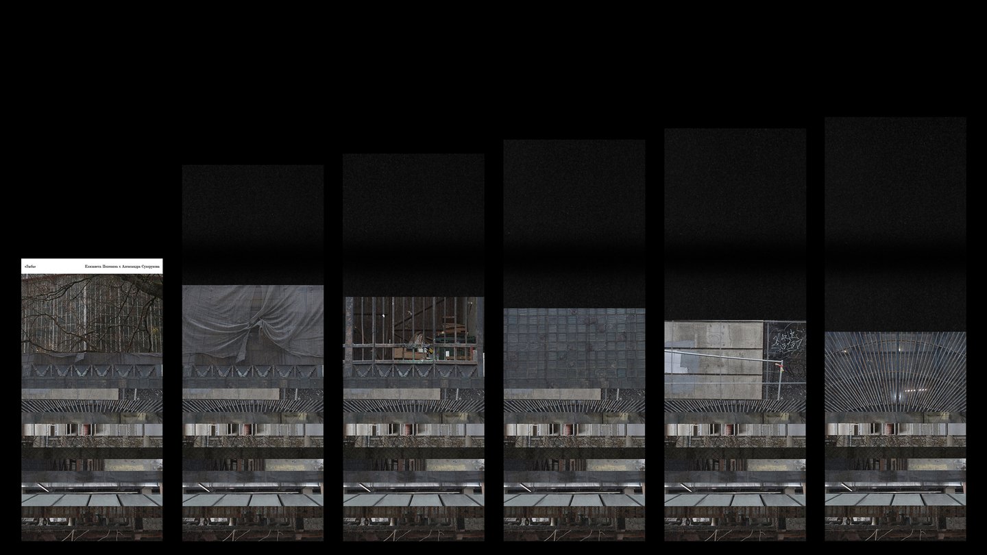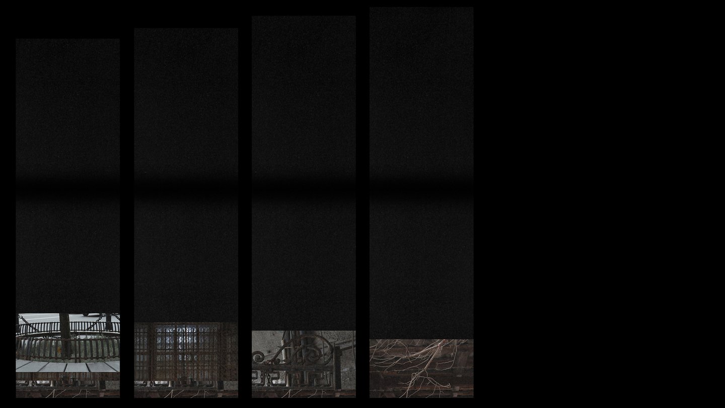 Наложение фотографий друг на друга, при котором на общем плане остаются видны лишь узкие горизонтальные полоски. Мельтешение усиливается, фрагменты нескольких фотографий превращаются в единый паттерн.