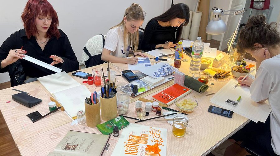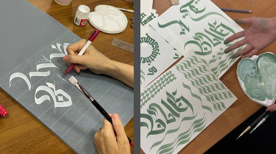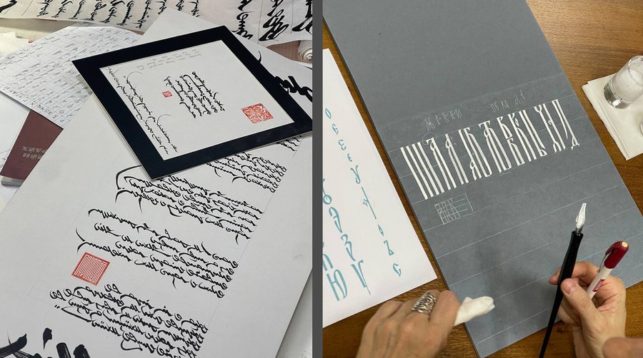 Студенты на курсе знакомятся с инструментами, классическими: ширококонечным пером, плоской кистью, остроконечным пером. И современными: параллель-пенами, кола-пенами, каллиграфическими шприцами и руллингами.